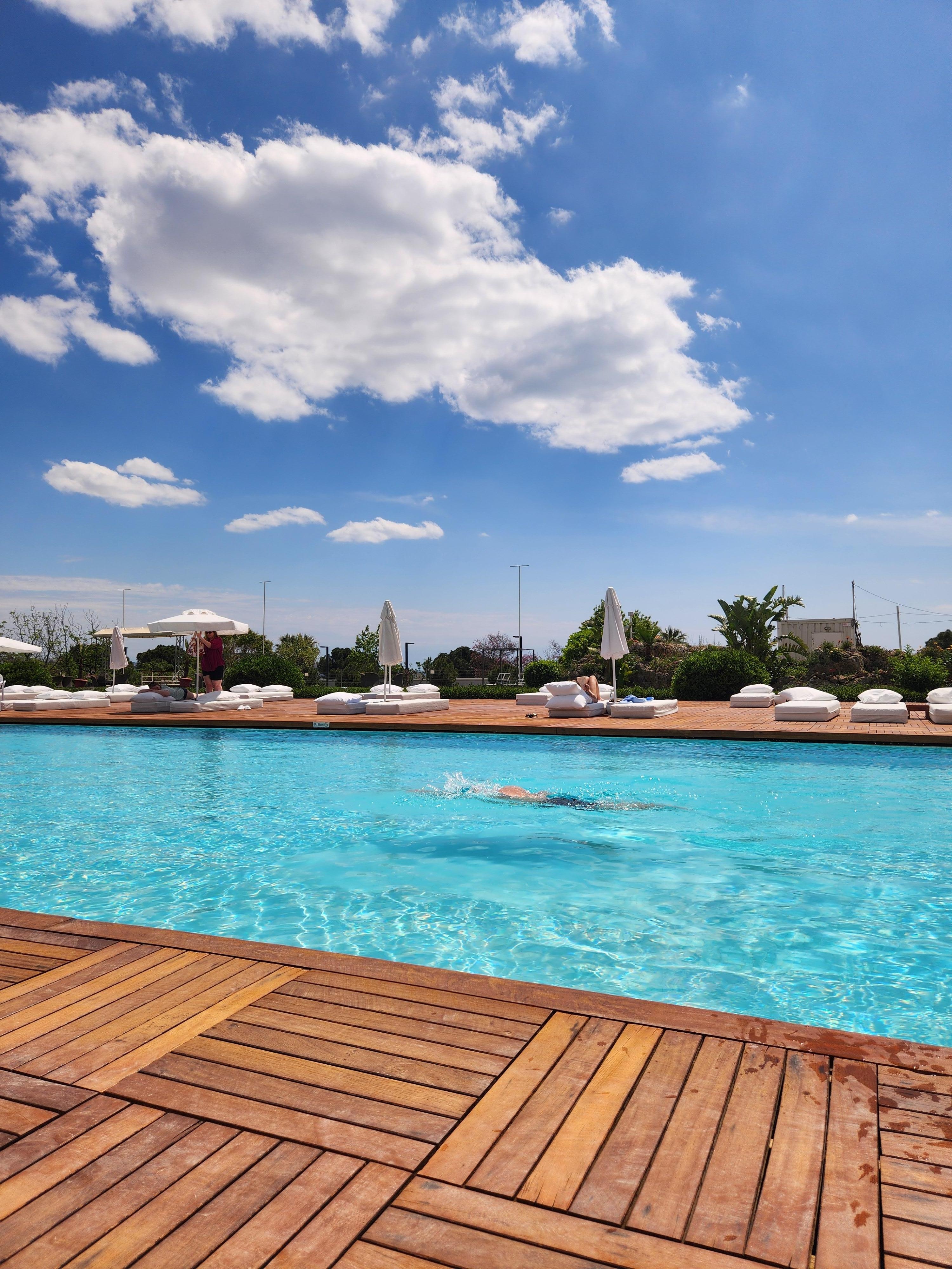 실내 수영장, 시즌별로 운영되는 야외 수영장, 수영장 파라솔, 일광욕 의자