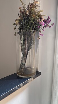 Cleanliness was poor: the oven was dirty, utensils unwashed, and there was no washing-up liquid or sponge to clean anything. A vase with dead flowers and dark, smelly water had been left in the kitchen, adding to the general sense of neglect.